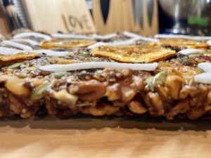 Main Ingredients: walnuts, pecans (optional), raisins, dates, coconut, dried apricots, dried oranges, pumpkin seeds, hemp seeds, agave, coconut sugar, grape seed oil, banana, spices, and a whole lotta LOVE!